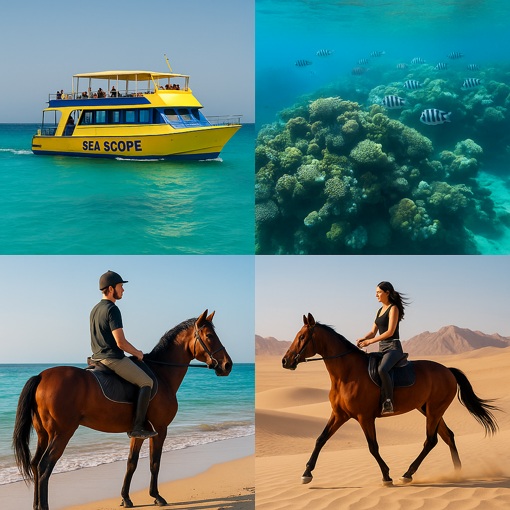 🌟 Erlebe einen Tag voller Magie! Starte mit der Royal Sea Scope Glasbodenboot-Tour und entdecke die farbenfrohe Unterwasserwelt des Roten Meeres – ganz ohne nass zu werden. Danach wartet ein unvergesslicher Ausritt auf sanften Pferden durch die Wüste und am Strand. Spüre Freiheit, Harmonie und Abenteuer in einem perfekt organisierten Kombi-Erlebnis. Jetzt buchen und Meer & Wüste an einem Tag genießen!